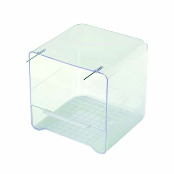 Bañera Reggio para pájaros fabricada en plástico rígido transparente, con ganchos metálicos y estructura compacta. Apta para todo tipo de pájaros pequeños: canarios, periquitos, exóticos, forpus, agapornis, etc. Totalmente transparente con gancho de alambre para colgar idónea para que nuestros pájaros se den un buen baño y mantener así una buena higiene. Se adapta a cualquier puerta y es idónea para colocar en el exterior de la jaula, ahorrando espacio. Por su forma, evita que el agua se ensucie con deposiciones.